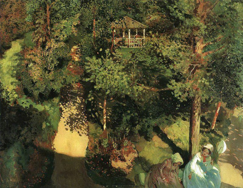 Сомов. Конфиденции. 1897. и чувствую, что Стернин, просто зная, что Сомов будет писать позже, описал дух этой картины так, как он описал. – Я уязвлён, что никакая конкретика картины не связывается в моей душе в ницшеанство, к которому – я знаю – принадлежит Сомов. Ну разве что сосновый парк является преддверием французских парков XVIII века, в которые Сомов убежал от категорически не устраивавшей его действительности – не конца XIX века, а вообще Этого мира. Это, да, пахнет декадентством, потому что, что ж это за место такое – вне Этого мира. Но я – против. Потому что есть радость умения выразить то иномирие непредставимое. Есть общий приём модерна, это умение обеспечивающее: живое рисовать как бы мёртвым, а мёртвое – как бы живым.