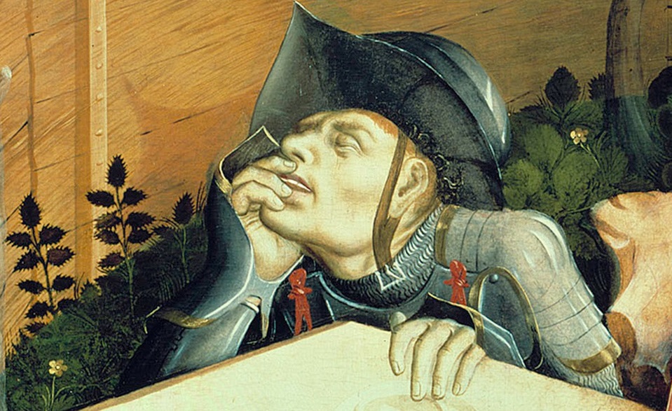 Мульчер. Воскресение Христово. 1437. Фрагмент. Изображён римский воин, приставленный караулить погребённого Христа и заснувший. "62 На другой день, который следует за пятницею, собрались первосвященники и фарисеи к Пилату 63 и говорили: господин! Мы вспомнили, что обманщик тот, еще будучи в живых, сказал: после трех дней воскресну; 64 итак прикажи охранять гроб до третьего дня, чтобы ученики Его, придя ночью, не украли Его и не сказали народу: воскрес из мертвых; и будет последний обман хуже первого. 65 Пилат сказал им: имеете стражу; пойдите, охраняйте, как знаете. 66 Они пошли и поставили у гроба стражу, и приложили к камню печать. 1 По прошествии же субботы, на рассвете первого дня недели, пришла Мария Магдалина и другая Мария посмотреть гроб. 2 И вот, сделалось великое землетрясение, ибо Ангел Господень, сошедший с небес, приступив, отвалил камень от двери гроба и сидел на нем; 3 вид его был, как молния, и одежда его бела, как снег; 4 устрашившись его, стерегущие пришли в трепет и стали, как мертвые” (Матф., 27 – 28). Так вот заснула римская стража, и на неё изливается у Мульчера индивидуальное переживание его и зрителя, глубоко верующих. Мерзкий тип изображён. "…человек — как смертная ограниченная изменчивая материя, как второстепенная и подчиненная высшему оболочка — противопоставлен выражению душевных порывов. На почве этого противопоставления развивается своеобразный меланхоличный реализм немецкой живописи первой половины XV в… Как на сцене, где разыгрываются мистерии, выступают… наравне с идеальными фигурами такие, которые находятся в резком противоречии с какой бы то ни было идеализацией [римские воины, для пущей действенности одетые в современные доспехи]: представители темных гибельных сил земного бытия и носителя человеческих преступлений, грехов и страстей — тусклая и слепая масса, с которой надлежит бороться высшим силам; все это [личная ненависть] первый шаг к новому обоснованию трагедии человеческой индивидуальности и судьбы, для которой не было места в рамках средневекового антиреализма” (История искусства как история духа. С. 182-183). Открытие заключается в том, что привносится какая-то индивидуальная ненависть к низменному. Ненавидимое – конкретно. Портретно. – Это Северное Возрождение в немецком изводе. XV век. Тогда как до того, в готике… "…возникло новое понятие художественной красоты и возвышенности, в котором материально красивая форма представляется выражением духовных преимуществ… ударение делается не на телесной характеристике, а на связанных с нею духовных свойствах… В этом союзе спиритуалистического идеализма средних веков с новым утверждением мира заключено происхождение нового художественного восприятия человека, которое мы обозначили как стремление раскрыть духовную личность… Духовные индивидуальности требуют естественным образом также и телесной индивидуализации… в этой индивидуализации сначала замечается сильная, заданная основными линиями христианских жизненных заповедей типичность [опущенные уголки губ, нахмуренный лоб – для осмысливающего сворю греховность]" (С. 120-121).
