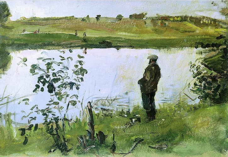 Серов. Художник К. А. Коровин на берегу реки. 1905. Картон, масло. И чихать его подсознательному идеалу на революцию, которую сознание его горячо защищало и творило произведения прикладного искусства (см. тут), приложенные к знаемым чувствам тревоги, выпрямленности и т.п. При взгляде на такой абсолютно ничем не примечательный пейзаж, всё же примечательный этой всё же ослепительно светлой водой, ёкает сердце – как ни убога Россия, а она бесценна.