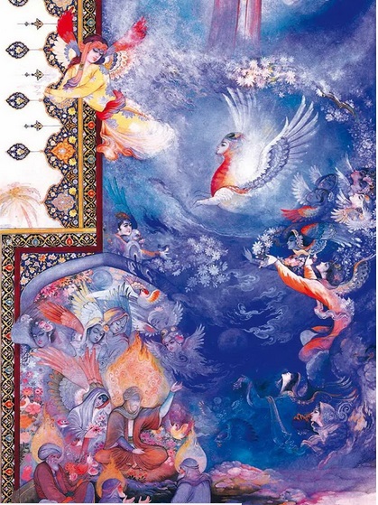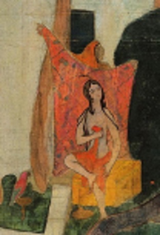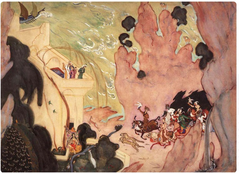 Вот это – Зобеида со своим любовником, закрывающим её красным покрывалом, чтоб она, обнажённая, успела что-то на себя натянуть. Два ягуара, скачущие перед всадниками, символизируют ярость Шахрияра. Лань, за которой все гонятся, - неотвратимость наказания. Всё это, вместе с утрированными скалами, деревьями, волнами на море, а главное – высокая, отстранённая точка зрения – несёт оттенок снисходительной усмешки над страстями-мордастями там, внизу. И выражают то самое одобрение абы какой жизни.