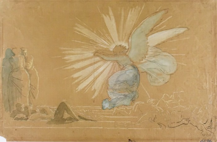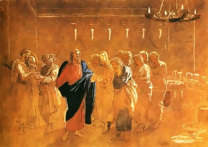 А вот текст Штрауса, подводящий к духовидности, правда, одного только Иисуса: "Последователи Иисуса не могли представить себе своего убиенного Мессию простым заурядным мертвецом или нереальным бесплотным призраком, поэтому у них сложилась вера в то, что он воскрес и вознесен был к Богу на небеса, а на почве такого верования создавалось у них представление об Иисусе, воскресшем и вознесенном на небеса, как о существе, которое по достоинству своему по меньшей мере равно прочим небожителям, то есть ангелам, или даже превосходит их, так как сам Бог даровал ему "всякую власть на небе и на земле" (Мф. 28:18). Но Иисус не мог быть равен им, если бытие его началось лишь с момента человеческого рождения, тогда как ангелы появились уже в момент сотворения Вселенной; чтобы сравняться с ними в этом отношении, он должен был существовать уже до момента своего человеческого рождения, а в момент рождения он как личность не появился впервые, а только сошел на землю, или перешел от прежней сверхчувствительной формы бытия к земной форме существования… … Наименование Иисуса "началом создания Божия" (Апок. 3:14) стоит на рубеже именно такого идеального и реального воззрения, к которому приводили также некоторые черты моисеевой истории сотворения Вселенной. Как известно, в первой книге Моисея имеются два рассказа о сотворении человека. В одном (1:27) говорится: "И сотворил Бог человека по образу своему, по образу Божию сотворил его; мужчину и женщину сотворил их". Во втором (2:7) говорится, что Бог Иегова слепил человека мужа из праха и вдунул ему дыхание жизни и затем сотворил ему жену из ребра его. Этот двойной рассказ навел новейших критиков на мысль о том, что первая книга Моисея составлялась из нескольких различных записей, а иудейских мыслителей он натолкнул на следующее открытие: если в одном рассказе говорится, что человек сотворен по образу и подобию Божию, а в другом, что он сотворен из праха, то, значит, в первом случае речь идет о человеке сверхчувственном, небесном, а во втором – о чувственном, земном”. Иванов, желая рисовать миф, духовное, попробовал в таком, крайне одухотворённом, виде попробовать нарисовать и вариант “Тайной вечери”. Нематериальность всех, а не только одного Иисуса означала, что в этой сцене предлагается людям не новая вера, а её символ (об этом и более материальном варианте “Тайной вечери” см. тут). Художник искал, какой вариант доходчивей об этом говорит. Другая причина создания Ивановым двух вариантов – варианты сцены в Гефсиманском саду. По Штраусу первые 3 апостола (Матфей, Лука и Марк) унизили Иисуса, показали его в слабости – молящим Отца о миновании мук. Что заметил 4-й евангелист, Иоанн, и дал легенду, которая "более продуманна и планомерна”: "…его [4-го евангелиста] Иисусу надлежало явиться на поле брани уже во всеоружии самообладания и мужества”.