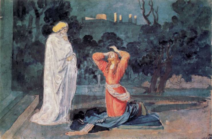 Иванов. Христос в Гефсиманском саду. Остаётся только вспомнить о своей идее-фикс, что художественно только то, что несёт следы подсознательного идеала автора, является неприкладным искусством, способом общения подсознания автора с подсознаниями восприемников, и не художественно (а несёт только эстетическую ценность {поразительно точно выражает знаемое переживание}), - не художественно то, что следов подсознательного идеала не несёт. Есть даже специальный термин для того, к чему приложенными оказались библейские эскизы Иванова – иеротопия. Это создание конкретных сакральных пространств, рассматриваемое как особый вид творческой деятельности. Творческой-то творческой, но получается, что библейские эскизы Иванова не художественны, ибо приложены к идее личностного (чуть ли не по-лютерански) переживания Бога (в пику засушенности официального православия его времени). 8 апреля 2020 г.