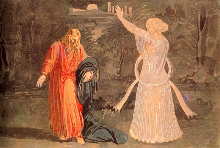 Иванов. Выход с тайной вечери. Образ предсказания дан в каком-то повторении цвета накидок Иисуса и Петра. Поэтическая красота (искусство слова в пику искусству вымысла) предсказания, как-то скрадывающая позор самого впоследствии почитаемого апостола, Петра, Штраусом порицается: "В рассказе Марка поэтическая фантазия рельефно проявилась в замечании о том, что прежде, чем петух пропоет в эту ночь дважды, Петр отречется от Иисуса трижды. Это сопоставление однократного пения петуха с троекратным отречением Петра – крайне неудачный вымысел и не заслуживает более подробного рассмотрения”. А Иванов со Штраусом не согласился и обеспечил красоту цветовым контрастом плащей Иисуса и Петра со всем остальным. И – перед нами воплощённое в цвете волшебство предсказания. Штраус: "В легендах той эпохи грядущее несчастье или бедствие часто предвещалось тем, что замкнутые двери внезапно раскрывались сами собою”. Пожалуйста.
