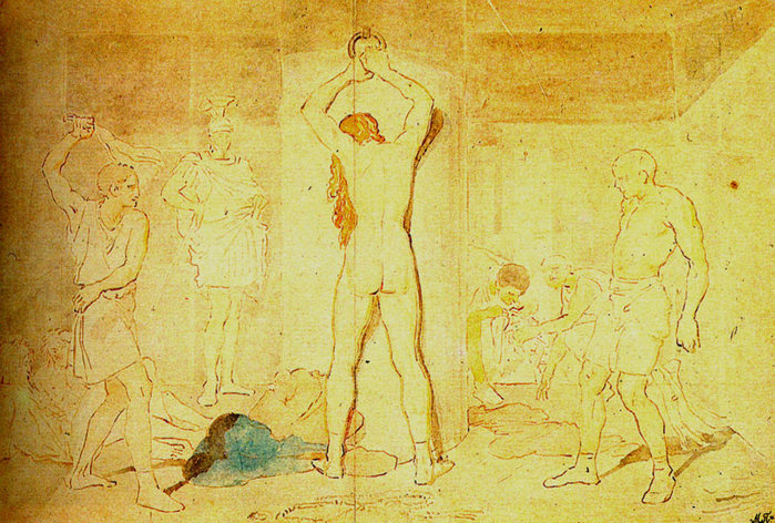 Это новизна наблюдения или нет? Некто Охоцимский написал по поводу библейских эскизов Иванова: "Штраус объяснил Иванову, что “вначале был образ”, а Библия – это лишь его словесное описание. Этот первичный образ он и стал рисовать”. Мифический. Так я что-то не читывал конкретных примеров сравнения писания Штрауса с деяниями Иванова. – Продолжу начатое (начало тут). Штраус. Отрицательный факт казни Христа и сопутствовавших действий "...приходилось истолковывать так, чтобы они утратили свой отрицательный характер и по возможности обратились в устои веры, чтобы их отрицательная ценность превратилась в ценность положительную и клеймо позора обратилось в знак почетного отличия” (https://e-libra.ru/read/129041-zhizn-iisusa.html). Если показать, что Христос был поко`рен наказаниям, как "это было предсказано Исаией в изречении, которое истолковывалось в мессианском смысле: "Я предал хребет Мой биющим и ланиты Мои поражающим, лица Моего не закрывал от поруганий и оплевания" (50:6) [то] Иисус тем самым показал, что он есть тот, кем не хотели признать его ослепленные враги” (Там же). Пожалуйста, Иванов так и рисует.