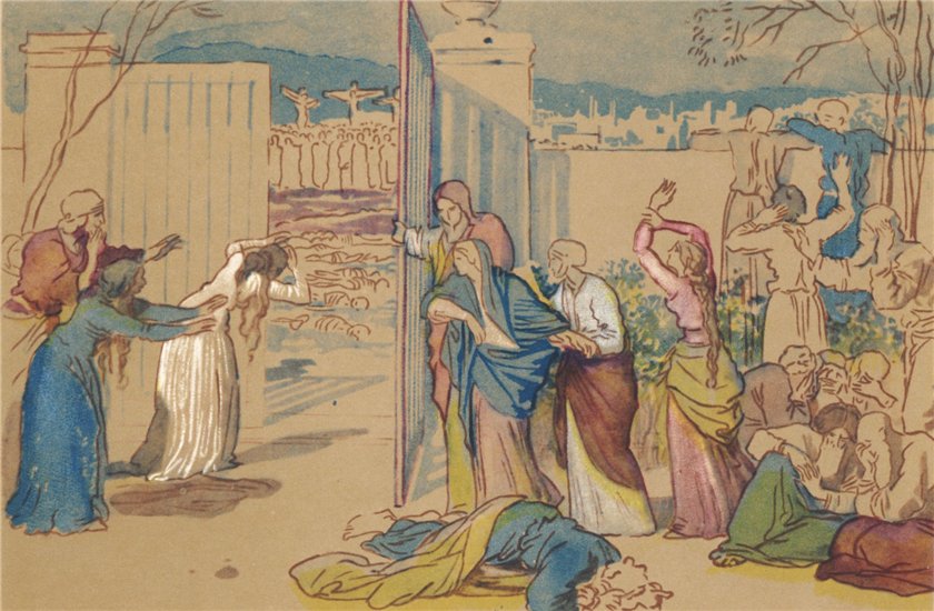 Иванов. Богоматерь, ученики Христа и женщины, следовавшие за ним, смотрят издали на распятие. Причём от солнечного затмения (явления естественного) Иванов отказался: тень отбрасывают ворота, мужчина и две женщины слева. Штраус: "Матфей здесь сообщает как о том, что увидели у гроба обе Марии, так и о том, что произошло там перед их приходом, а именно "сделалось великое землетрясение" и сошел ангел с небес, как молния сверкающий, и отвалил камень от гроба, а стражники при гробе устрашились и стали как мертвые. Это последнее обстоятельство Матфей отмечает, очевидно, с той целью, чтобы показать, как и почему устранилось сопротивление стражников, о которых упоминает лишь Матфей и ничего не сообщают прочие евангелисты”. Пожалуйста.