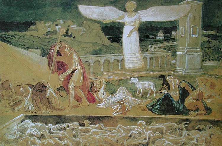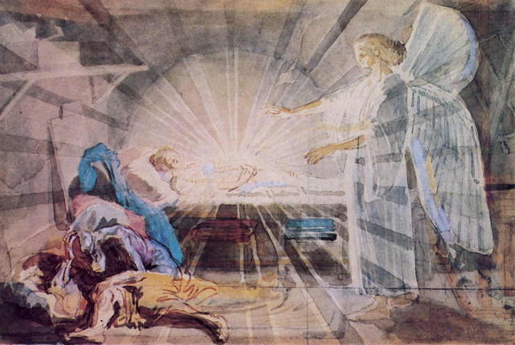 Иванов. Сон Иосифа (“Не бойся принять Марию, жену твою”). Сомнения Иосифа изображены горестной позой его на полу, схватившегося за лысую голову. Так, пожалуй, и заснуть невозможно. Или это момент его просыпания от озарения во сне: увеличенный живот Марии на кровати сияет, как солнце, по мановению правой руки Гавриила. – Чудо! Штраус: "Праотцы еврейского народа тоже были пастухами и среди стад своих получали откровения свыше. Первому Спасителю народа иудейского, Моисею, ангел Господень явился в то время, когда тот пас стада своего тестя Иефрона, или Иофора (Исх. 3:1), а предка Мессии, Давида, Бог призвал из овечьего загона, близ Вифлеема, чтобы пасти избранный народ Божий (Пс. 77:70; 1 Цар. 16:11), точно так же и греко-римская легенда повествует о своих героях Кире и Ромуле, что они росли и жили среди пастухов. Вот почему в данном случае первого извещения о рождестве младенца – Мессии были удостоены убогие и кроткие пастухи в поле, а не фарисеи и книжники и не жестоковыйный царь Ирод в столичном городе Иерусалиме”. Пастухи в поле, так пастухи в поле…