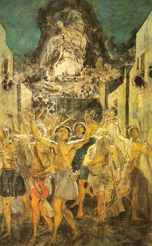 Иванов. Славословие пастухов. Воинство небесное – это, наверно, то, что мы видим на эскизе в ночном небе над городом. Кроме эскиза “Выход с тайной вечери”, всюду чего больше: иллюстрации слов Библии или изовымысла? – Я боюсь, иллюстрации слов. Что не красит художника. Спасает его только адресация к своим, тоже глубоко верующим людям. Хотя светящийся живот – это что-то. Но красоты цвета и рисунка Иванов явно избегает. – Почему?.. В эскизе “Выход с тайной вечери” исключение… – Это из-за духовидности? Не должно быть материального удовольствия? Или просто не всюду получалось совместить