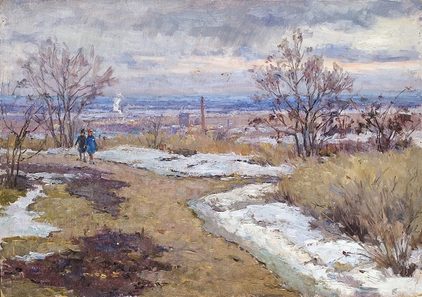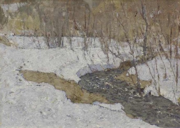 Бритов. Ранняя весна. 1963. Там, вон, ручей журчит – какая тишина. И вообще не про тишину думать, когда весна дышит. Не знаю. Невыразимо. А потому – сверхтонко. Что-то громадное чуется. Просыпается аж Природа. На заглавные буквы тянет. Благо – в слове Россия можно не стесняясь заглавную применять. – Надо же… Такая тусклятина, а такое ЧТО-ТО где-то в груди… Я такое пережил раз как раз на Украине. Я жил в маленьком городе Ромны, Сумской области. Это в 80-ти километрах от злосчастного Батурина, который сжёг Меньшиков (правда, вместе с украинцем Иваном Носом). И было мне лет 8. Я был, вообще-то послушным мальчиком, маменькиным сыночком меня называли (я был полусиротой и не хотел маму удручать плохим поведением). Но один раз весна, видно, во мне взыграла, и я удрал из школы и пошёл домой кружным путём, спустившись к речке, Суле. На ней лёд ещё не начал вскрываться. Но льдины косо торчащие у берега я почему-то помню. И никакими словами не передать то чувство свободы, которое я переживал. Горе Украине, что её история так сложилась, что я (правда, где-то с 10 лет ставший чувствовать себя русским, тогда же перестав на Украине жить) не ассоциирую теперь журчание ручья в снегу с Украиной, а ассоциирую это с великой Россией, когда смотрю на картину русского художника. Меня 10-летнего перевезли жить в Литву. И там я озорничал покрепче – ходил по здорово широкому Неману, по потрескавшемуся льду. Но родиной Литву я не чувствовал. Родиной, как оказалось – по запаху осоки – я чувствовал Украину. Но – как такую часть СССР. Ну и того чувства свободы я больше как-то не пережил вне Украины. В общем, при рассматривании нарочито напритязательной картины Бритова я переживаю – парадокс – величие России, не Украины. Сделаем эксперимент. Посмотрим на картину украинского художника, тоже нарисовавшего раннюю весну.