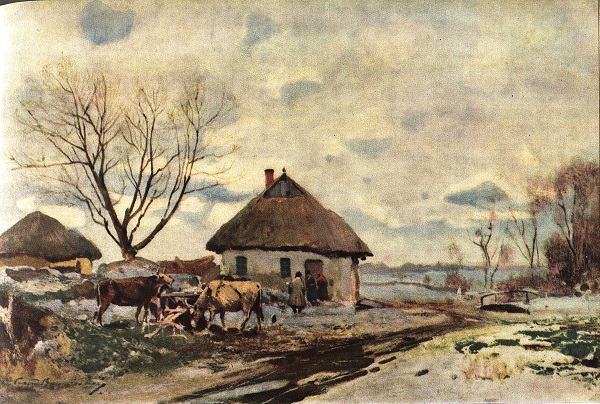 Васильковский. Ранняя весна. 1900-е. Совершенно не то! Где та безмерная свобода, ассоциирующаяся с Россией (да свобода, воля, связанная с легендарной бескрайностью России; где-то читал про молчаливый договор народа и власти: кто из крепостных удрал – его не ищут, потому что не найдут в такой шири; про великие сибирские стройки вспомните, кто может; я – подумывал было уехать). – У Васильковского, наоборот, заземлённость на хозяйство, а не вольный полёт. Что и соответствует, кстати, разнице менталитетов русского и украинского. Русский я обозначаю сокращённой мною цитатой из Феофана Затворника: “Дело не главное в жизни. Главное - настроение сердца”. А у украинца обратно: дело – главное. Возьмём другое полотно.