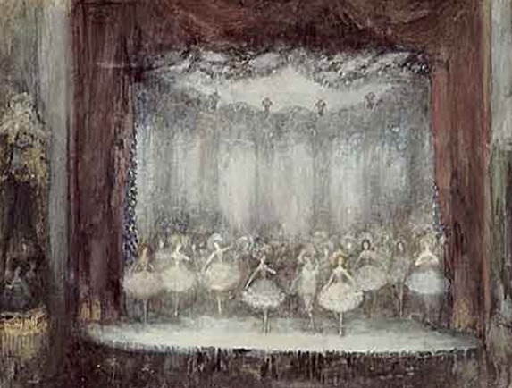 Сапунов. Балет. 1906. На моё впечатление влияло то, что это вещь того, кто через 6 лет умер не без связи с тем, что у него был сифилис. А сифилис в принципе плохо вяжется с символизмом. Ибо сифилис подхватывают обуреваемые, скажем так, индивидуалистскими позывами. А символизм связан с порывами коллективистскими. Да, порывы эти вызваны разочарованием в действительности. Она плохая. Может и с сифилисом быть. И, подумалось, что тогда в принципе понятно, почему именно у Сапунова такой пессимизм его побега в туманное далёко, когда у других символистов, физически здоровых, оно тоже пессимистично по другой причине – из-за удалённости в сверхбудущем достижения их благого для всех идеала. О том, что порывы “вверх” могут быть у того же человека, у какого есть и порывы “вниз”, я могу судить по себе. В связи с этой вот репродукцией мне вспомнилось, как я плакал на балете “Лебединое озеро”. Я только делал первые шаги в любви. И очень неловкие. Ибо был невзрачен. Зато был очень активен. В душе своей я частично уже разочаровался. Первую любовь я (из-за той же невзрачности) таил. И она у меня так и прошла, не проявившись вовне. И я понял, что любви единственной и до гроба для меня, по крайней мере, нет. Значит, для меня – какие-то любови поменьше. С другой стороны, я не хотел катиться вниз по моральной наклонной плоскости. Первое меня заставляло знакомиться и ухаживать. Второе – мечтать. На балете в Мариинском театре я оказался (приехав в Ленинград походить по музеям) с двумя адресами двух красавиц, заполученными в доме отдыха. Одна была красавица-полька, блондинка. С нею я надеялся продолжить письменное знакомство, после единственного вечера, когда я с нею познакомился (на завтра кончалась её смена в доме отдыха). А с другой красавицей, русской, шатенкой, я познакомился вечером перед завтрашним моим отъездом из этого дома отдыха. И предложил ей в Ленинграде, куда я завтра уезжал, зайти к её родственникам передать от неё привет. А на балете для меня полька была Одеттой, а русская – Одиллией. И я метался, на какую же мне держать курс в дальнейшем. Что довольно дурно пахло. Но на сцене, тем не менее, была разнообразнейшая – в том числе и цветовая – роскошь, а не такая серятина, как у Сапунова. Я из-за серятины на этой репродукции и запнулся. Сапунов, прочёл я, впоследствии от символизма (коллективизма и добра, по-моему понятию) отказался и пустился рисовать жирно-красочно (ударился в индивидуализм и зло, по-моему же). Я же в последнем итоге склонился к идеалу благого сверхбудущего (что является типом идеала, общего для христианства, маньеризма и других подтипов идеалов этого типа). Так мне представляется, что серость и сифилис как-то связаны у Сапунова.