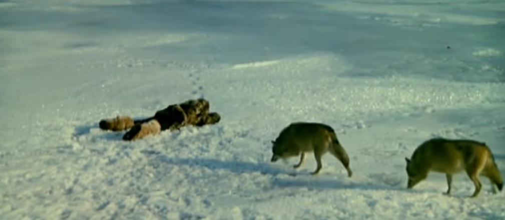 Седьмой раз мелодия представляет собой гитарный перезвон, имитирующий похоронные колокола. – Ильин, понимай, спустился в пропасть. Крестовский оказался ещё жив. И вот его Ильин, - вполне в духе несдающихся большевиков, - упрямо тянет. Куда? К морю. Парусник что: ждёт возврата экспедиции? А Крестовский (перед смертью же, под ту самую мелодию) сомневается, - в том же по-большевистски гуманистическом духе, - не зря ли он прожил свою жизнь. И выводит, что если Ильин сумеет вернуться к своим, а потом спасти онкилонов, то "мы не зря погибли” (все, кроме Ильина). И последний раз эта, опять изменённая и просветлённая, мелодия звучит над идущим по ледяной пустыне одиноким Ильиным. Но. За ним идут волки (мелодия искажается до неузнаваемости). Пистолет, бывший у Крестовского, когда он стрелял во врага-онкилона, оказывается у Ильина (ну, можно думать, что после смерти Крестовского Ильин пистолет у него взял), и Ильин стреляет по волкам. Как те, причём не белые, каковыми являются полярные волки,