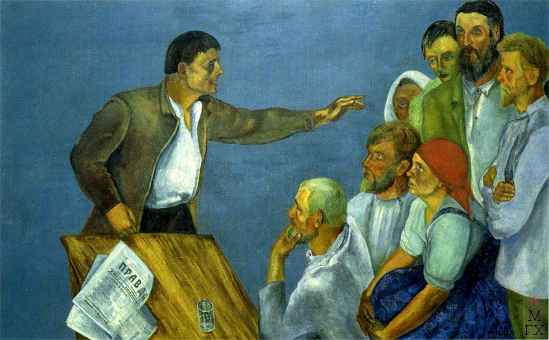 Штеренберг. Митинг в деревне (Агитатор). 1929. От трезвости тут – эта однообразная пассивность сомнения крестьян. Все – как один. Класс единоличников, который не устранишь. От трезвости – перегиб в виде опрокидывающегося стола. Стол опрокидывается от душевного порыва агитатора. Он-то говорит вещи, как дважды два четыре, ясные, а до них не доходит. Он и метнулся вперёд. А художник на его стороне: он не даёт стакану наклоняться и разливаться, падая. В 1971-м обиженный на какую-то буксующую без толку советскую власть Гайдай, из желания выразить респект её противнику Бендеру, это с улыбкой повторил (упавший – стул незаметно утянул Киса – Бендер, встал, так и не расплескав полный вина бокал, который он держал перед падением). – Штеренберг на стороне агитатора всерьёз: как ровно написана голубизна абстрактного фона. Это о будущем неведомом, но благом коммунизме и пути к нему. И художник, и его персонаж не сомневаются в его наступлении. – Никакой доли насмешки. Но и никакой насмешки и над упрямцами крестьянами. Он – за исключением одной бабы, почти заслонённой – не лишил ни одного индивидуальности. Самый молодой, безбородый, смотрит вниз, соображая, – до него, кажется, начинает доходить расчёт. Одинаково бородатые остальные, но каждый не похож на другого, совершенно ещё не дошли до смысла. Женщина и вовсе загипнотизирована, видно, городским видом доброго молодца, агитатора. Художник всех понимает, потому что исповедует идеал Гармонии низкого и высокого. (До него не доходит, что такой идеал предполагает эволюцию в изменении низких людей к гармонии, тогда как объективно начался так называемый великий перелом – революционный, трагический.) И поскольку он этого не понимает, у него определённая живопись. Никакого хаоса мазков. Даже гладкопись, можно сказать. Нормативизм: все мужчины один другого красивее. Но натурализма ему не нужно. Откуда падает свет – не видно. На тенях художник не настаивает (одна есть от пиджака агитатора, другая – от локтя крайнего справа), но, по шее агитатора судя, свет не за спиной агитатора, а над и правее его головы. Словно к ним уже пришла лампочка Ильича. Понимал ли Штеренберг, что его идеал того же типа, что в Высоком Возрождении? – Наверно, нет. Потому что он себя чувствовал авангардистом, то есть отступившим от канонов классического искусства. То есть он искажает действительность (эта неопределённость источника света, места собрания, неразливающийся в падении стакан), тогда как Леонардо да Винчи стремился к иллюзионости в передаче того, что изображал. Но, определяя тип идеала, не надо зацикливаться на стиле. Лучше – на идеостиле. Уверенность в историческом будущем Гармонии была одинаковой и у Леонардо, и у Штеренберга. 6 июля 2020 г.