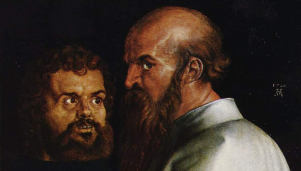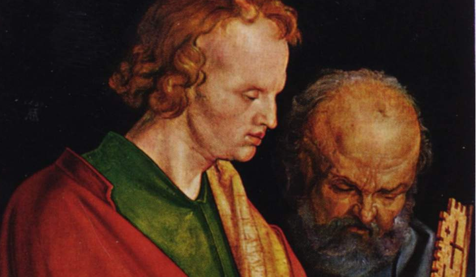 Марк и Павел. 1526. Так открытие состоит в том, что только лицо в глубине стоящего Петра больше лица впереди стоящего Иоанна. А лицо позади стоящего Марка НЕ БОЛЬШЕ лица впереди стоящего Павла. – Посмотрите сами. Трезво. Без самовнушения. Но самое главное, что это соответствует тому, как я когда-то понял этот диптих, исходя из того, что в 1524-1526 годах шла в Германии Крестьянская война, затеянная в последнем итоге Реформацией. С сотнями тысяч убитых: "Перед нами занёсшиеся в новообразовавшейся реформистской догме. И усомнившиеся. Первые смотрят в открытое Евангелие. Вторые закрыли и задумались”. Так вот мистика позитивного отношения к Евангелиям подкреплена обратной перспективой, а критичность к ним – отсутствием этой мистической обратной перспективы. Аж лёгкий страх охватывает, если я прав. Всё-таки без 6 лет 5 веков смотрят люди на диптих. И что: я первый это заметил? 29 июля 2020 г.