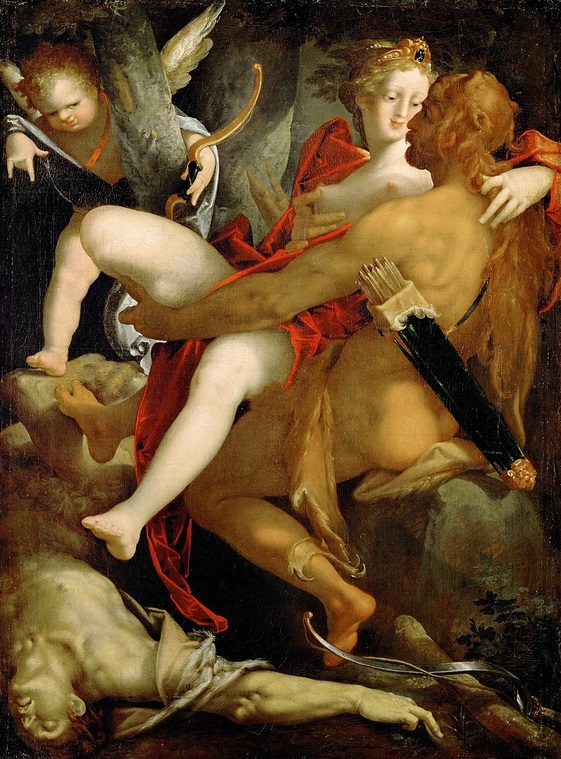 Бартоломеус Спрангер. Геркулес, Дейанира и Нессус. 1580–85. "Опасаясь, что Геракл завел новую любовницу в Иоле, его жена Деянира дарит ему "рубашку" (на самом деле хитон), которая была запятнана кровью кентавра Несса. Умирающий Нессус обманул ее, заставив поверить, что она послужит зельем для обеспечения верности ее мужа. На самом деле, она содержала яд лернейской гидры, которым Геракл отравил стрелу, которой убил Несса” (Википедия). Нессус – тот, кто лежит мёртвый, его кентаврская суть видна в шерсти ниже пояса. Отравленная рубашка – это, наверное, красное. Обрадовавшись красивому подарку, даже не надев его, Геркулес бросается лапать Дейаниру, не сняв колчан со стрелами, и она довольна. И ещё тут есть посланец Рока. Рубашка погубит Геракла. А вообще всё не важно. Важно, что выражается “фэ” плотским излишествам не только темой, но и некрасивой (натуралистичной) правой ляжкой Дейаниры, деформированной под рукой Геркулеса мышцей adducter longus. Формула идеостиля маньеризма такая же, как и для христианства: благое для всех сверхбудущее. Вызван стиль к жизни крайними непереносимостью безнравственности католичества и невозможностью это победить. Показ крайностей телесности (Геркулес возбуждает Деяниру, надавливая ей на сосок и беря в руки её промежность) взывает к нравственности, потерпевшей полное поражение не только в настоящем, но и (раз такое показано) в будущем, оставляя надежду только на сверхбудущее. Некрасивая же мышца не должна оставить сомнение в отрицательной авторской позиции к телесности. А сомнение мыслимо. Ибо действие (вопль к аскетизму) рождает противодействие (вопль ко вседозволенности). И маньеризм раскололся на выражении противоположных ценностей. Но исторически первым (у Микеланджело) было “фэ” (гипертрофией мышц) вседозволенности. А “фэ” аскетизму взяло себе на вооружение буйство цвета. Здесь явный акцент на повывернутости тел. Лицо Деяниры повёрнуто влево от неё, туловище – вправо, бёдра – опять влево. То же – с вестником. Геркулес ничем никуда не повёрнут, зато ноги и руки его – так и вьются. В те годы (восьмидесятилетней войны католиков и протестантов), когда писалась картина, родной город Спрангера, Антверпен, был осаждён испанцами (июль 1584 — август 1585). А те – католики. И протестанты считали их безнравственными. Это добавляло резона художнику завертеть "крутую спираль тел”. 8 января 2023 г.