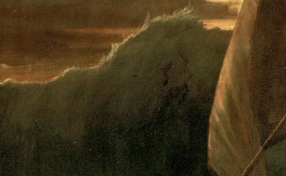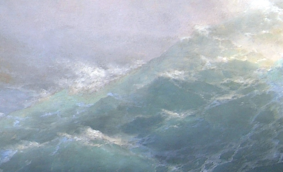 Айвазовский. Волна. 1889. Образом плохой жизни является бессилие тонущих спастись. Образом прекрасного своего внутреннего мира является сияние этого моря (хоть, казалось бы, реалистически, отчего ему сиять, если такие тучи). Думая, что под современной живописью Долинина непременно понимает укоренившееся с конца 19 века натурокорёжение, оценивать качество живописи Айвазовского нужно сравнением с романтиками, жившими до него. Сравним на фоне неба гребень волны со сдуваемой ветром пеной Айвазовского (с резкостью 1000 пикселей по горизонтали)