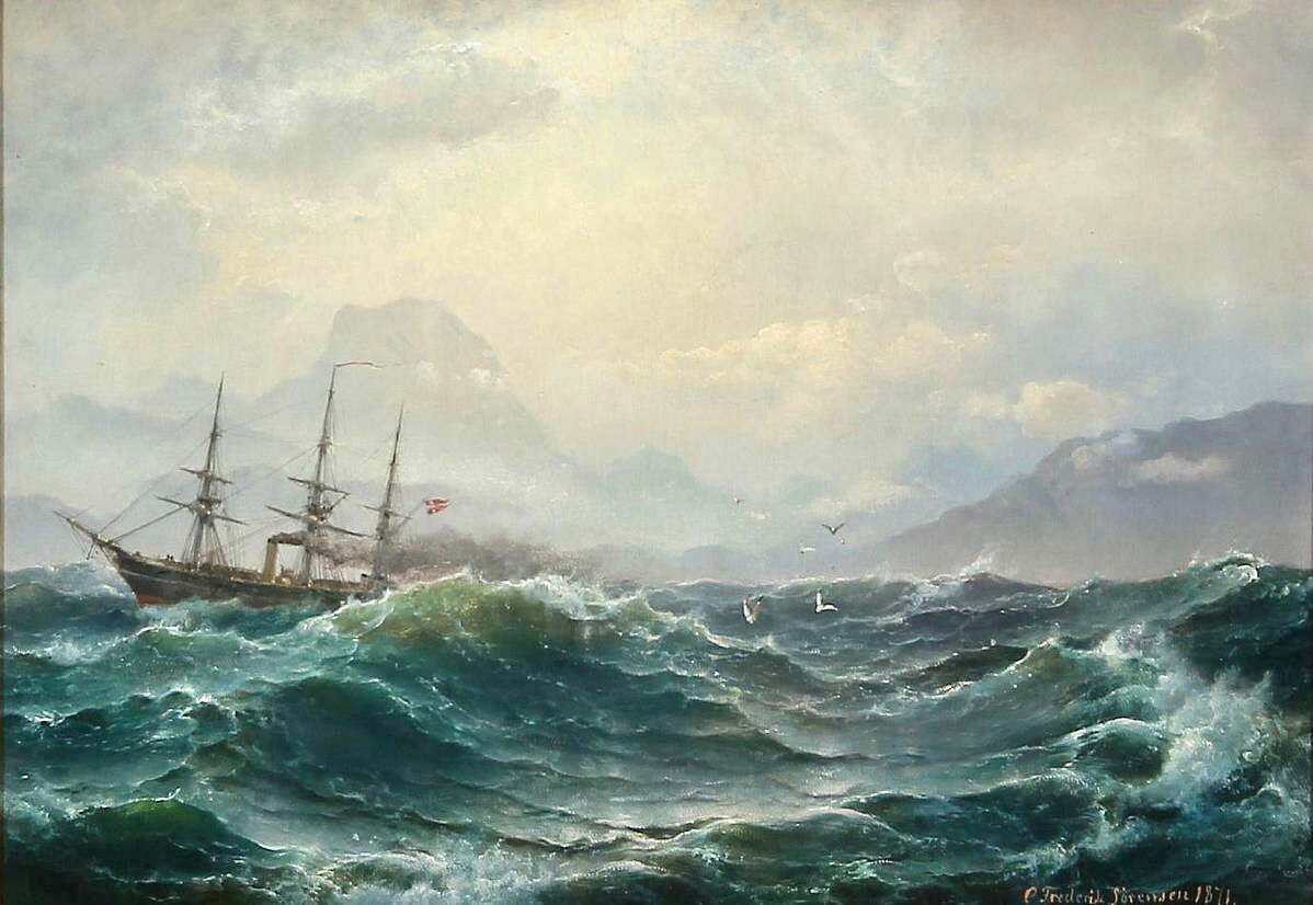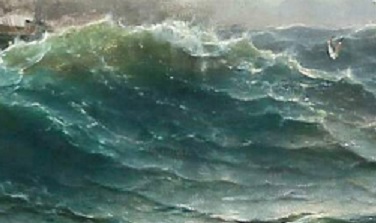 Серенсен. Пароход в бурном море. 1879. Тут, глядя на гребень волны со сдуваемой ветром пеной, и без увеличения видна виртуозность руки художника.
